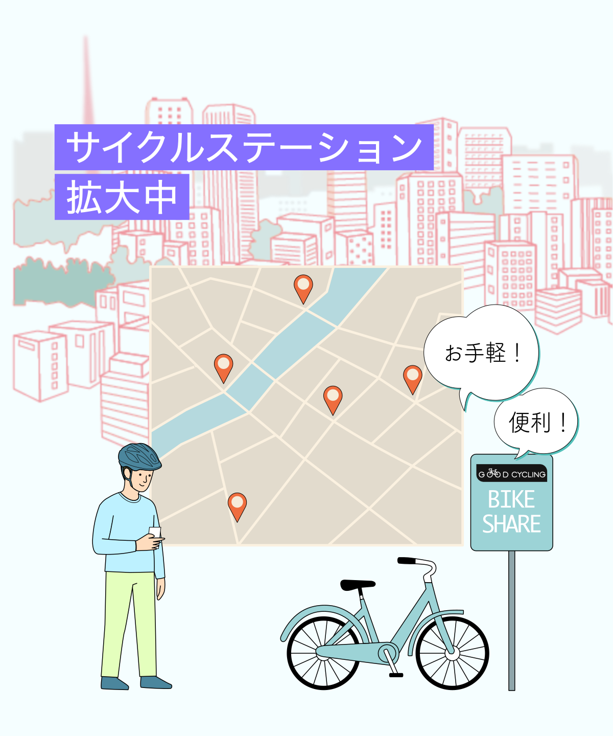 「新しい都市型シェアサイクルで好きな時に、好きな場所へ。都市をもっと自由に移動しよう。」